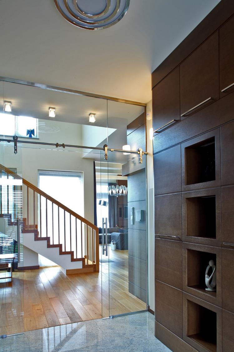 Первый этаж формирует одно открытое пространство. Вестибюль отделен от гостиной стеклянной стеной.